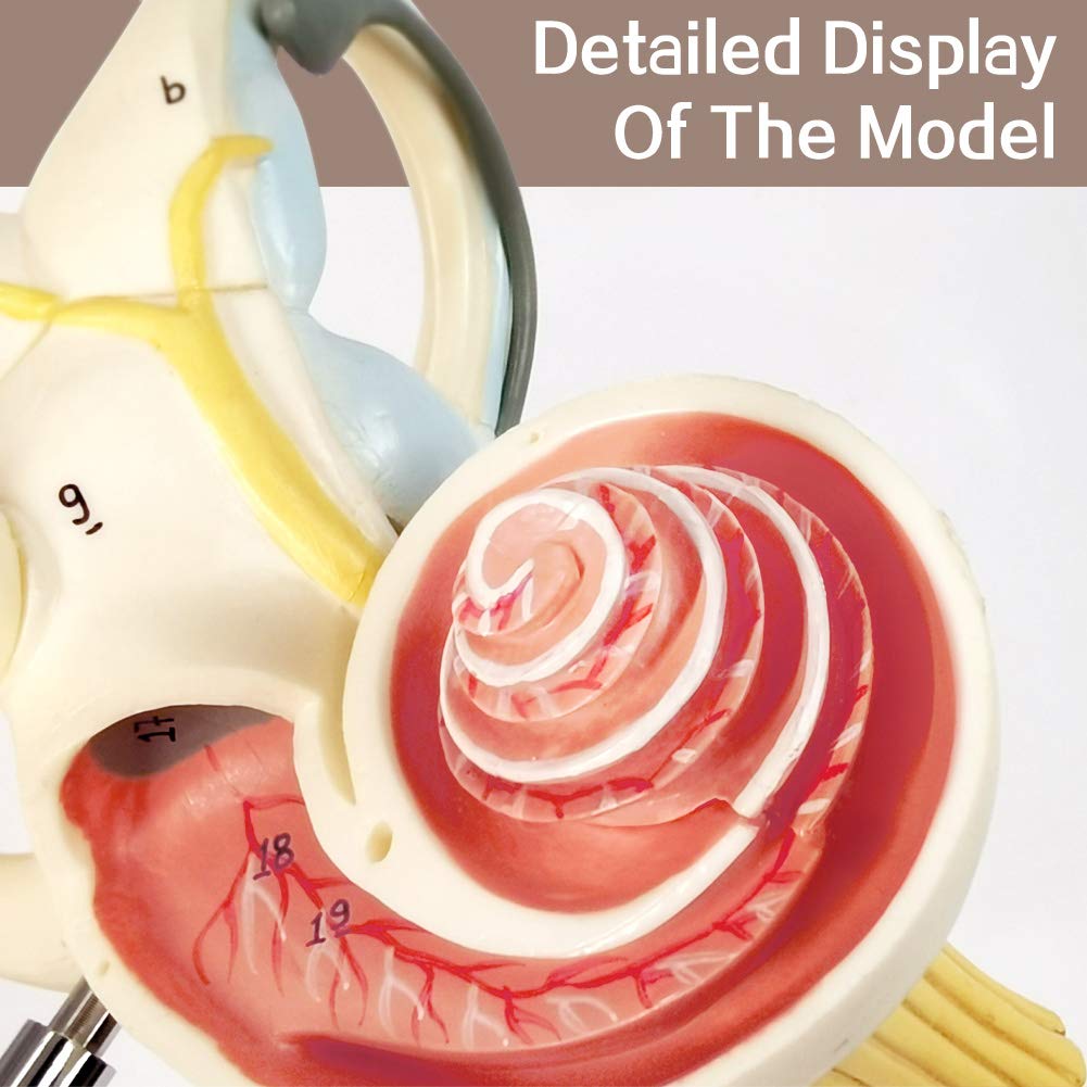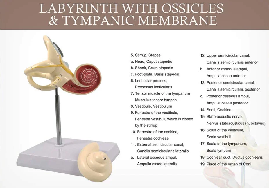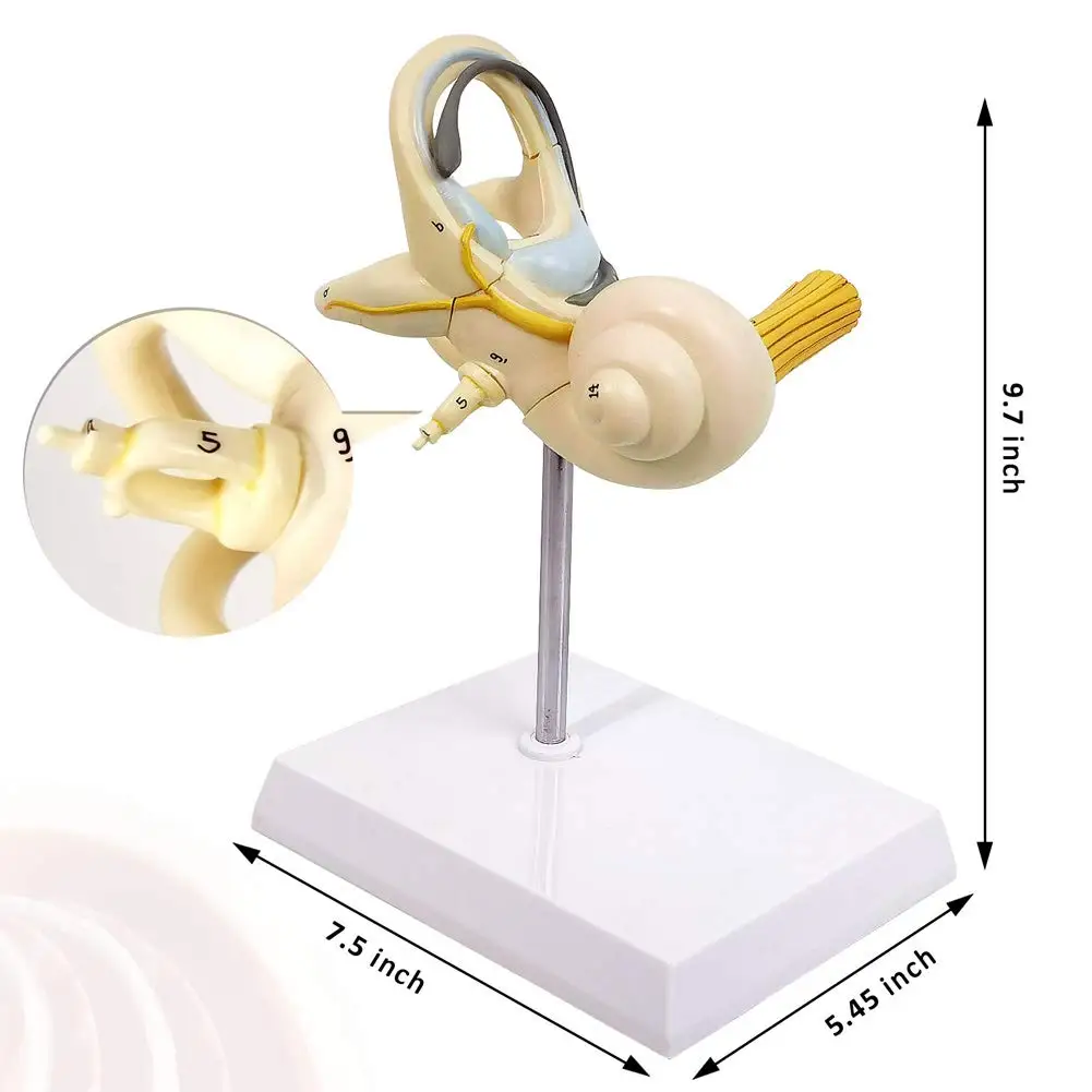 Дотор чихний бүтцийн загварыг заах – Энэ загвар нь дотор чихний лабиринтын 8 дахин томруулсан загвар юм. Сууринд суурилуулсан. Загвар нь хоёр хэсгээс бүрдэнэ: дотор чихний лабиринт (ясны лабиринт болон мембраны лабиринт орно) болон чихний дунгийн бүрхүүлийг тайрч нээснээр чихний дунгийн дотор бүтцийг харж болно. , Чихний дунгийн мэдрэл болон бусад бүтэц. Хагас дугуй болон үүдний танхим нь уут болон гуурсыг харуулдаг. Материал ба ур чадвар – Эмнэлгийн чанар. Хүний дотор чихний загвар нь хоргүй PVC материалаар хийгдсэн бөгөөд цэвэрлэхэд хялбар. Үүнийг нарийн гар аргаар нарийн будсан бөгөөд суурь дээр суурилуулсан. Хэрэглээ – Дотор чихний анатомийн загварыг зөвхөн анагаахын оюутнуудад зориулсан анатомийн сургалтын хэрэгсэл төдийгүй эмч, өвчтөнүүдийн харилцааны хэрэгсэл болгон ашиглаж болно. Сургууль, эмнэлэг, бие бялдрын эрүүл мэндийн сургалтанд харааны хэрэгсэл болгон ашиглахад тохиромжтой. Эмчилгээний практик эсвэл коллежийн анатоми ба физиологийн хичээлд ашиглаж болно. Зөөврийн 3D манекен – Манай дотор чихний анатомийн загвар нь таны цүнхэнд багтах, хичээлд авч явахад зөөврийн хэмжээтэй. Анатомийг хайрлагчдад төгс бэлэг. Мөн тавиур дээр эсвэл шүүгээнд байрлуулж, үзүүлэн тавихад тохиромжтой гоёмсог чимэглэл.